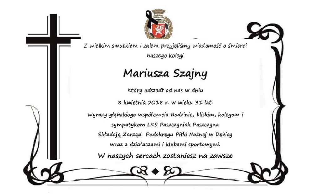 Aktualności Ostatnie Pożegnanie zawodnika LKS Paszczyniak Paszczyna 10 kwietnia 2018 Gallery Published by: admin Pogrzeb Ś.P. Mariusza Szajny w odbędzie się dniu 11 kwietnia (środa) 2018 r. Msza Święta Żałobna w Kaplicy Cmentarnej w Paszczynie . o godz. 15.00 o godz. 14.30 Różaniec.