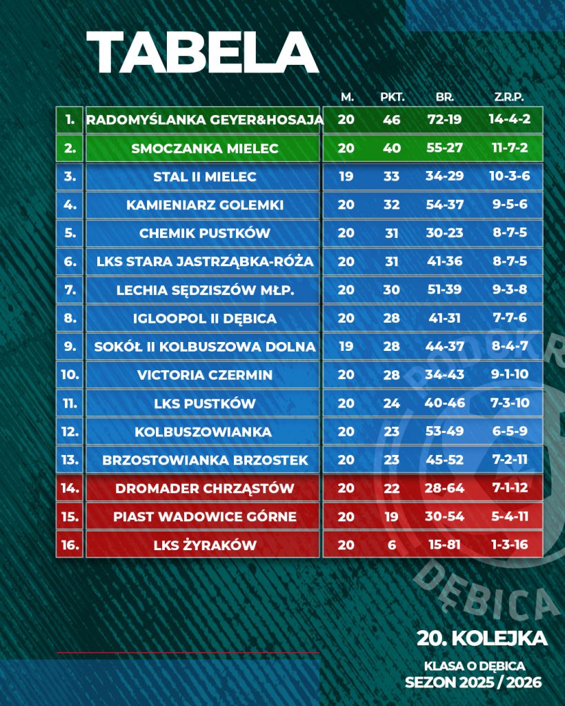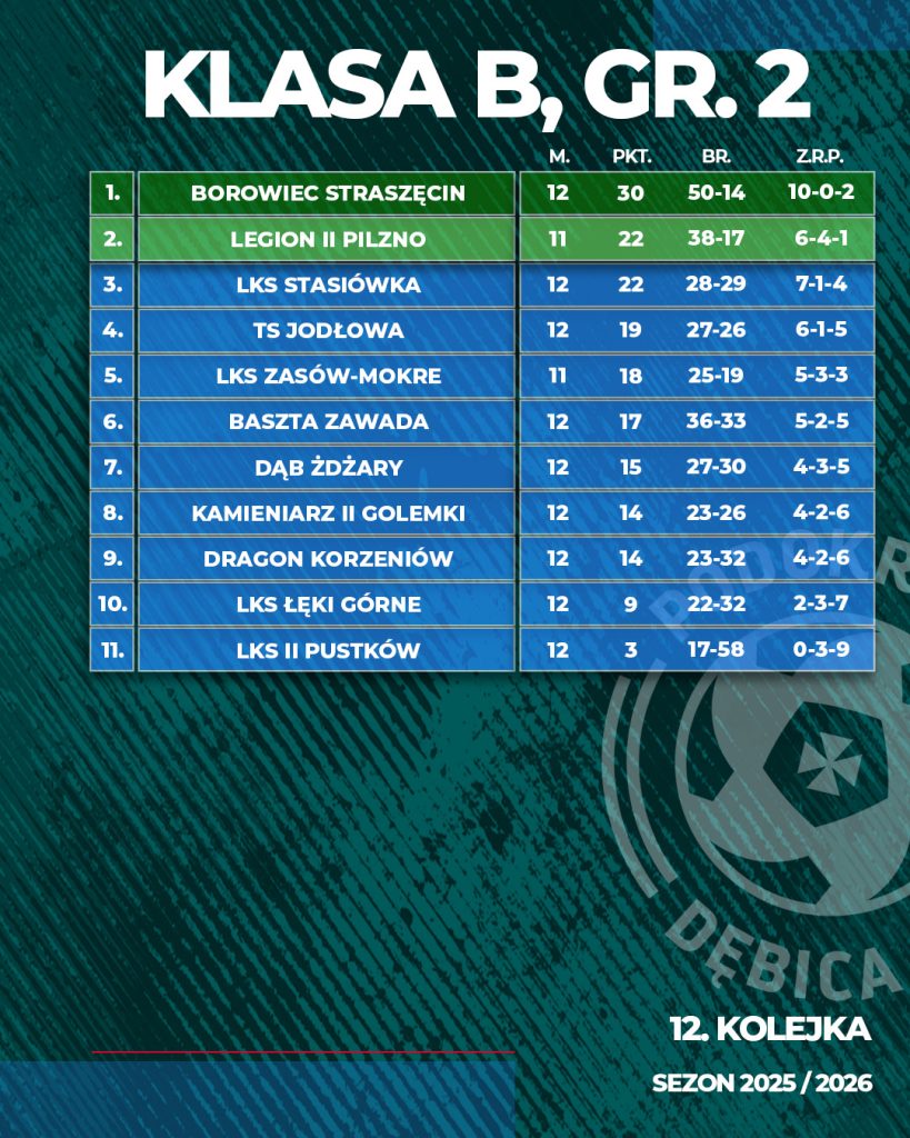 Tabela po 11-12 kwietnia 2026 r. Kl. Okręgowej, KL. A, Kl.B gr.I oraz Kl. B gr. II ⚽️ ⚽️ zapraszamy na kolejne mecze.⛹️♂️